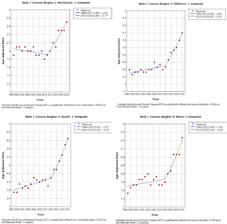Methods: In this descriptive study, the death certificate data were retrieved from the Centers for Disease Control and Prevention Wide-Ranging Online Data for Epidemiologic Research (WONDER) database and examined from 1999 to 2018 for the underlying cause of death. Age-adjusted mortality rates (AAMR) per 100,000 persons and annual percent change (APC) in rates stratified by census region were calculated using Joinpoint trend analysis software.