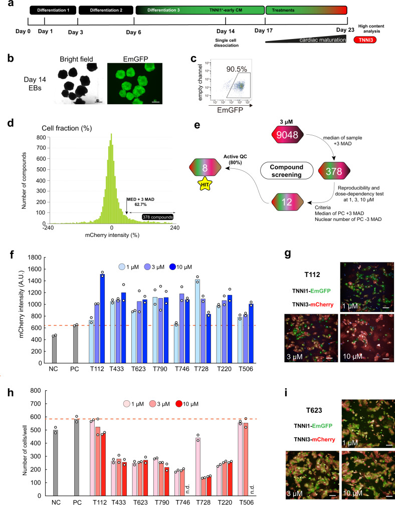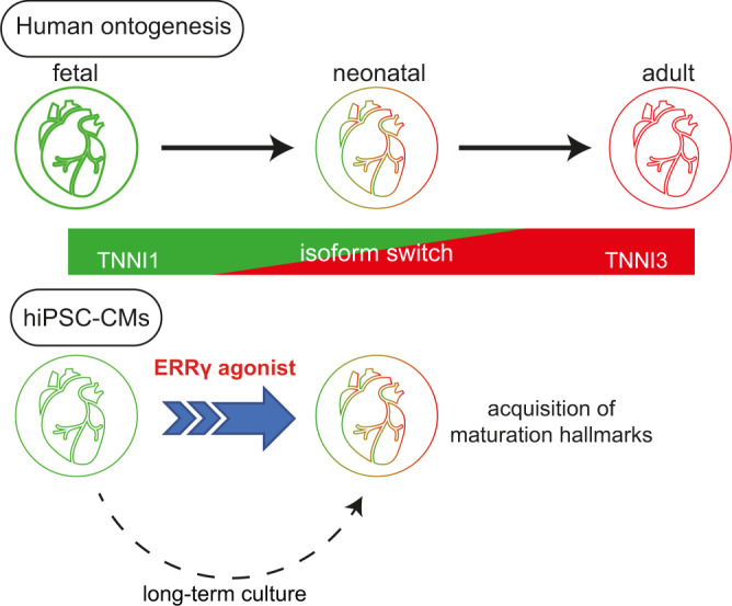 One of the earliest maturation steps in cardiomyocytes (CMs) is the sarcomere protein isoform switch between TNNI1 and TNNI3 (fetal and neonatal/adult troponin I). Here, we generate human induced pluripotent stem cells (hiPSCs) carrying a TNNI1EmGFP and TNNI3mCherry double reporter to monitor and isolate mature sub-populations during cardiac differentiation. Extensive drug screening identifies two compounds, an estrogen-related receptor gamma (ERRγ) agonist and an S-phase kinase-associated protein 2 inhibitor, that enhances cardiac maturation and a significant change to TNNI3 expression. Expression, morphological, functional, and molecular analyses indicate that hiPSC-CMs treated with the ERRγ agonist show a larger cell size, longer sarcomere length, the presence of transverse tubules, and enhanced metabolic function and contractile and electrical properties. Here, we show that ERRγ-treated hiPSC-CMs have a mature cellular property consistent with neonatal CMs and are useful for disease modeling and regenerative medicine.
