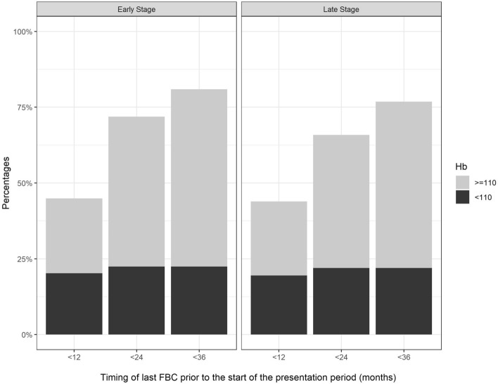 Iron deficiency anaemia (IDA) is common in colorectal cancer (CRC), especially, in right-sided CRC which is known to have an overall worse prognosis. The associations between diagnostic pathway (Bowel Cancer Screening Programme (BCSP), IDA, symptomatic) and tumour side/stage was assessed using logistic regression models in 1138 CRC cases presenting during 2010-2016 at a single secondary-care centre in the UK. In the IDA sub-group, the relationship between CRC stage and the event of having a blood count prior to CRC diagnosis was examined using Bayesian parametric survival model. IDA was found as the only significant predictor of right-sided CRC (OR 10.61, 95% CI 7.02-16.52). Early-stage CRC was associated with both the IDA (OR 1.65, 95% CI 1.18-2.29) and BCSP pathway (OR 2.42, 95% CI 1.75-3.37). At any age, the risk of detecting CRC at late-stage was higher in those without a previous blood count check (hazard ratio 1.53, 95% credibility interval 1.08-2.14). The findings of this retrospective observational study suggest a benefit from diagnosing CRC through the detection of IDA, and warrant further research into the prognosis benefit of systematic approach to blood count monitoring of the at-risk population.