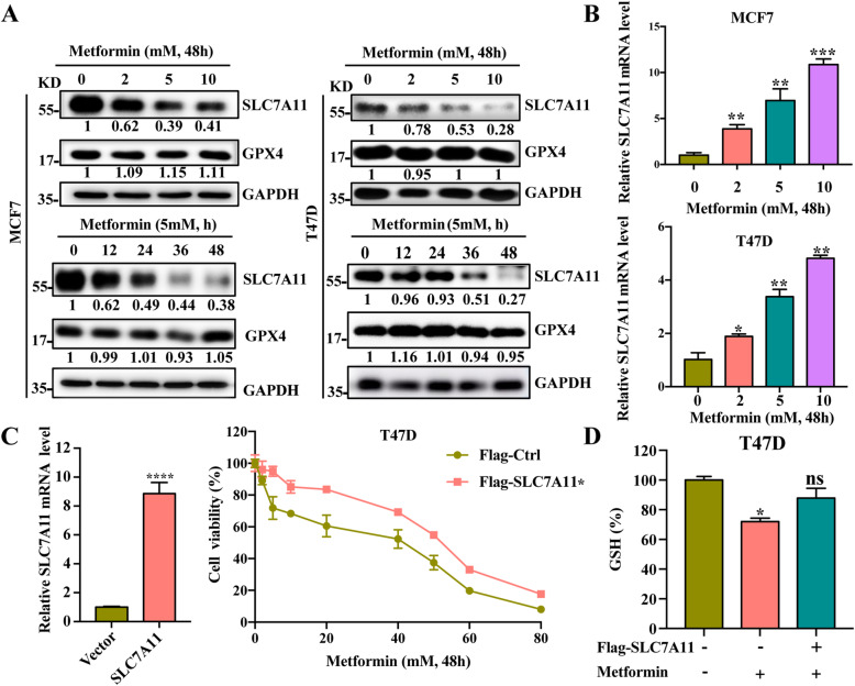 Results: Metformin induces ferroptosis in an AMPK-independent manner to suppress tumor growth. Mechanistically, we demonstrate that metformin increases the intracellular Fe2+ and lipid ROS levels. Specifically, metformin reduces the protein stability of SLC7A11, which is a critical ferroptosis regulator, by inhibiting its UFMylation process. Furthermore, metformin combined with sulfasalazine, the system xc- inhibitor, can work in a synergistic manner to induce ferroptosis and inhibit the proliferation of breast cancer cells.