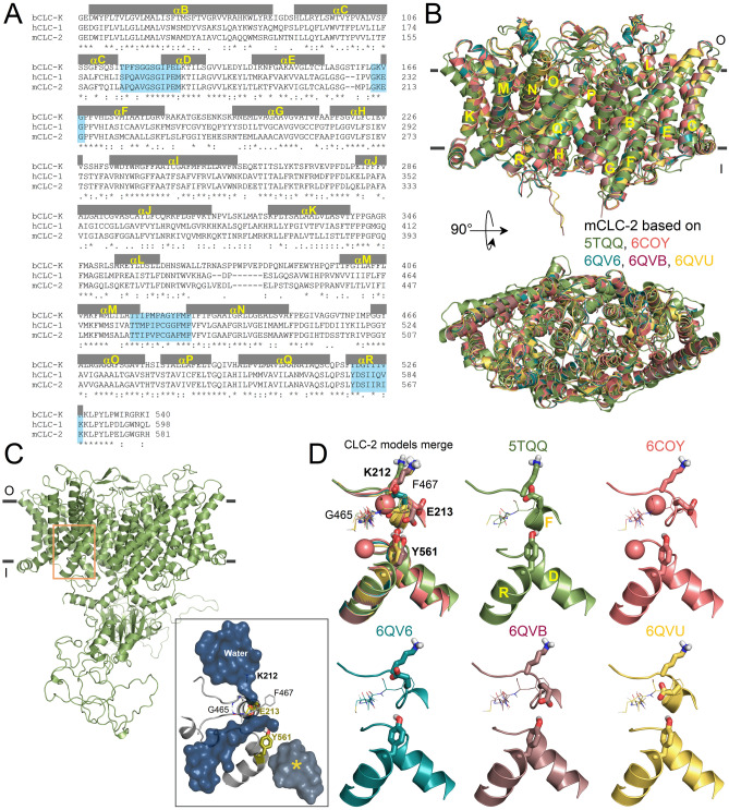 The widely expressed two-pore homodimeric inward rectifier CLC-2 chloride channel regulates transepithelial chloride transport, extracellular chloride homeostasis, and neuronal excitability. Each pore is independently gated at hyperpolarized voltages by a conserved pore glutamate. Presumably, exiting chloride ions push glutamate outwardly while external protonation stabilizes it. To understand the mechanism of mouse CLC-2 opening we used homology modelling-guided structure-function analysis. Structural modelling suggests that glutamate E213 interacts with tyrosine Y561 to close a pore. Accordingly, Y561A and E213D mutants are activated at less hyperpolarized voltages, re-opened at depolarized voltages, and fast and common gating components are reduced. The double mutant cycle analysis showed that E213 and Y561 are energetically coupled to alter CLC-2 gating. In agreement, the anomalous mole fraction behaviour of the voltage dependence, measured by the voltage to induce half-open probability, was strongly altered in these mutants. Finally, cytosolic acidification or high extracellular chloride concentration, conditions that have little or no effect on WT CLC-2, induced reopening of Y561 mutants at positive voltages presumably by the inward opening of E213. We concluded that the CLC-2 gate is formed by Y561-E213 and that outward permeant anions open the gate by electrostatic and steric interactions.