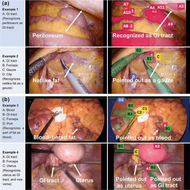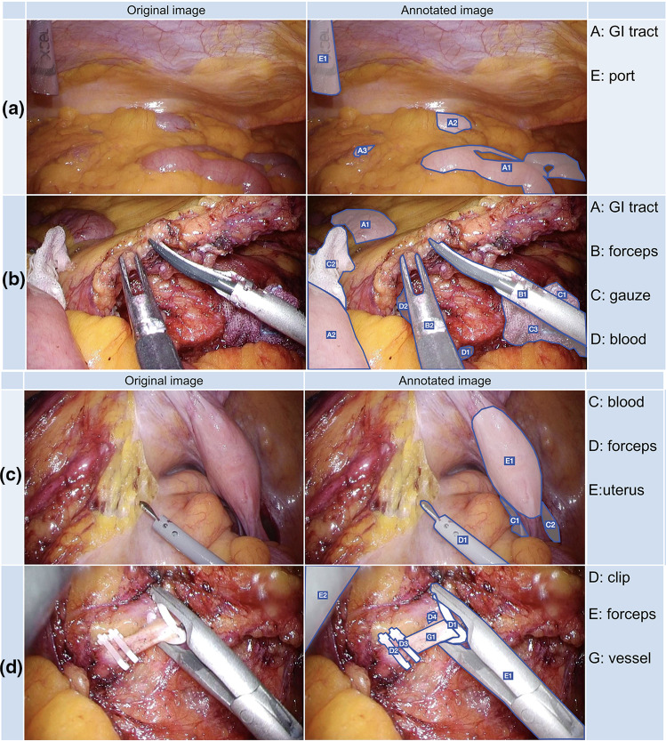 Methods: The surgical videos used for annotation were recorded during surgeries conducted in the Department of Surgery of Tokyo Women's Medical University from 2019 to 2020. Abdominal endoscopic images were cut out from manually captured surgical videos. An open-source programming framework for CNN was used to design a model that could recognize and segment objects in real time through IBM Visual Insights. The model was used to detect the GI tract, blood, vessels, uterus, forceps, ports, gauze and clips in the surgical images.
