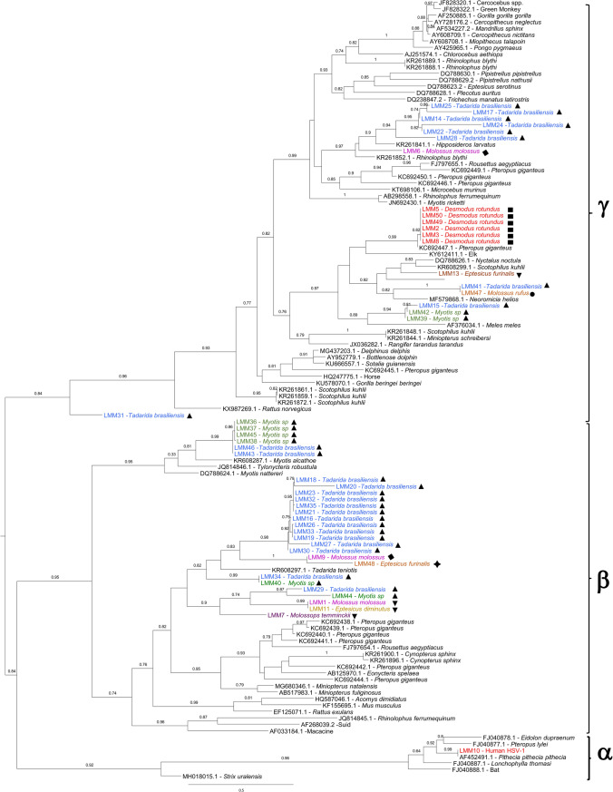 Bats are the second most diverse order of mammals and key species for ecosystem functioning, providing a wide range of ecosystem services, from pest control to seed dispersal. Chiropterans are known for hosting a large diversity of viruses, in some cases with little or no effect to their health. Here, we report on the results of a screening for DNA (Herpesviridae) and RNA viruses (Rhabdovirus and Pneumovirus), finding a high prevalence and wide diversity of both Beta- and Gamma-Herpesvirus in insectivorous and hematophagous bats of the southern cone of South America. Our findings suggest that bats in the southern neotropics harbor a high diversity of herpesviruses and, at least in some cases, the viral community in the bat species is more strongly associated with ecological traits of the hosts, rather than their taxonomy. The presence of a separate clade into the Gammaherpesvirinae subfamily in the common vampire bat suggests the independent circulation of herpesviruses in hematophagous and insectivorous bats and highlights the properness of these viruses to track vampire bats' population structure for rabies studies. Hence, we suggest that as other pathogens viruses may be used to track the population dynamics of their hosts, including movement and demographics.