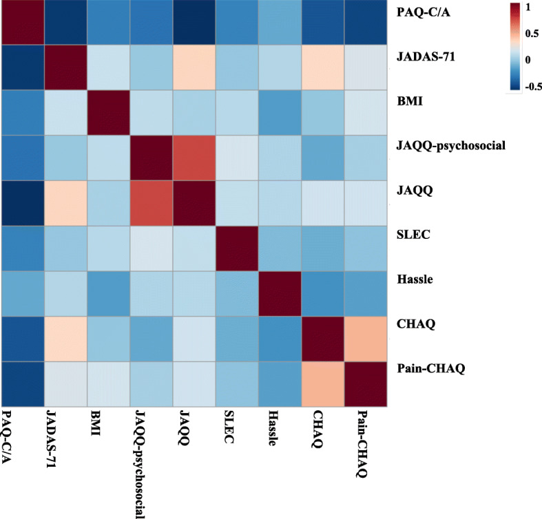 Methods: In 82 children with newly diagnosed JIA, PA levels, prospectively determined at enrollment, 12 and 24 months using the Physical Activity Questionnaire for Children (PAQ-C) and Adolescents (PAQ-A) raw scores, were evaluated in relation to disease activity as reflected by arthritis activity (Juvenile Arthritis Disease Activity Score (JADAS-71)), function, pain, and psychosocial stresses using a linear mixed model approach. Results in the JIA cohort were compared to normative Pediatric Bone Mineral Accrual Study data derived from healthy children using z-scores.