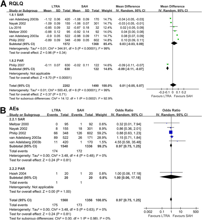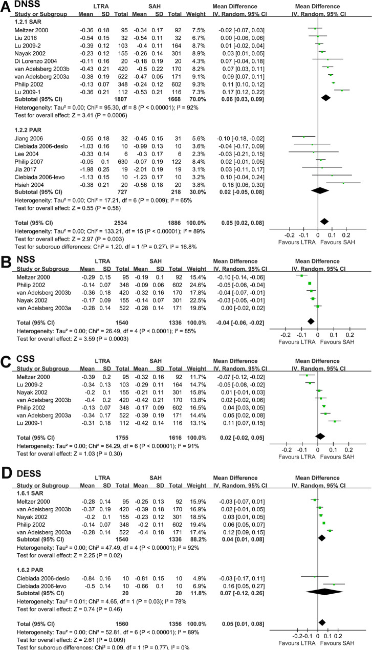Results: Fourteen RCTs comprising 4458 patients were included. LTRAs were inferior to SAHs in terms of the daytime nasal symptoms score (mean difference [MD]: 0.05, 95% confidence interval [CI] 0.02 to 0.08, p = 0.003, I2 = 89%) and daytime eye symptoms score (MD: 0.05, 95% CI 0.01 to 0.08, p = 0.009, I2 = 89%), but were superior in terms of the nighttime symptoms score (MD: - 0.04, 95% CI - 0.06 to - 0.02, p < 0.001, I2 = 85%). The effects of the two treatments on the composite symptom score (MD: 0.02, 95% CI - 0.02 to 0.05, p = 0.30, I2 = 91%) and rhinoconjunctivitis quality-of-life questionnaire (RQLQ) (MD: 0.01, 95% CI - 0.05 to 0.07, p = 0.71, I2 = 99%) were similar. Incidences of adverse events were comparable (odds ratio [OR]: 0.97, 95% CI 0.75 to 1.25, p = 0.98, I2 = 0%). These results were mainly obtained from studies on seasonal AR. No significant publication bias was detected.