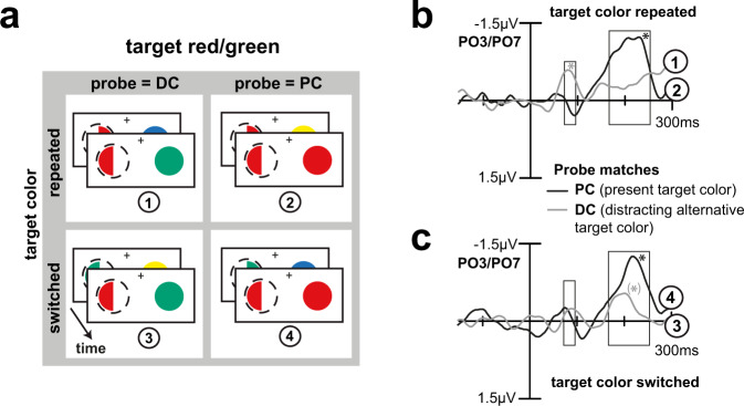 Whether doing the shopping, or driving the car - to navigate daily life, our brain has to rapidly identify relevant color signals among distracting ones. Despite a wealth of research, how color attention is dynamically adjusted is little understood. Previous studies suggest that the speed of feature attention depends on the time it takes to enhance the neural gain of cortical units tuned to the attended feature. To test this idea, we had human participants switch their attention on the fly between unpredicted target color alternatives, while recording the electromagnetic brain response to probes matching the target, a non-target, or a distracting alternative target color. Paradoxically, we observed a temporally prioritized processing of distractor colors. A larger neural modulation for the distractor followed by its stronger attenuation expedited target identification. Our results suggest that dynamic adjustments of feature attention involve the temporally prioritized processing and elimination of distracting feature representations.