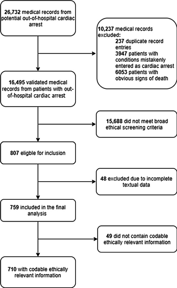 Methods: This was a Danish nationwide retrospective observational study of out-of-hospital cardiac arrests from 2016 through 2018. After an initial screening using broadly defined inclusion criteria, two experienced philosophers performed a qualitative content analysis of the included medical records according to a preliminary codebook. We identified ethically relevant content in free-text fields and categorised the information according to Beauchamp and Childress' four basic bioethical principles: autonomy, non-maleficence, beneficence, and justice.