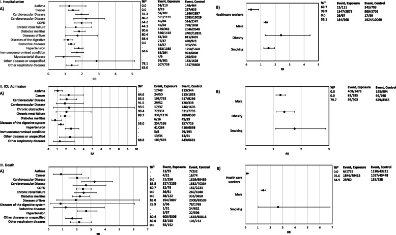 Methods: We performed a rapid systematic review and meta-analysis on studies and publicly accessible data to quantify associations between predisposing health conditions, demographics, behavioural factors on the one hand and hospitalisation, ICU admission, and death from COVID-19 on the other hand. We provide ranges of reported and calculated effect estimates and pooled relative risks derived from a meta-analysis and meta-regression.
