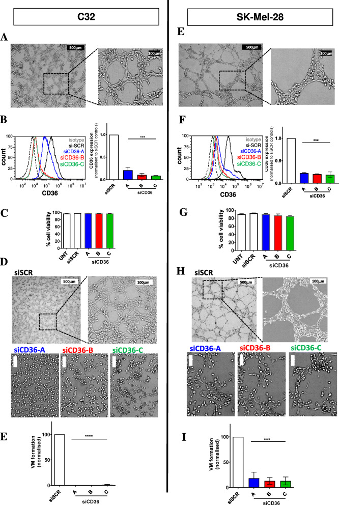 Results: Herein we demonstrate that CD36, a cell surface glycoprotein known to promote angiogenesis by ECs, also supports VM formation by human melanoma cancer cells. In silico analysis of CD36 expression within the melanoma cohort of The Cancer Genome Atlas suggests that melanoma patients with high expression of CD36 have a poorer clinical outcome. Using in vitro 'angiogenesis' assays and CD36-knockdown approaches, we reveal that CD36 supports VM formation by human melanoma cells as well as adhesion to, and invasion through, a cancer derived extracellular matrix substrate. Interestingly, thrombospondin-1 (TSP-1), a ligand for CD36 on ECs that inhibits angiogenesis, has no effect on VM formation. Further investigation revealed a role for laminin, but not collagen or fibronectin, as ligands for CD36 expressing melanoma cells.