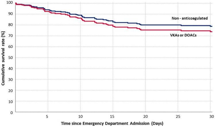 Conclusions: Among older patients hospitalized for COVID-19, chronic OAC therapy was not associated with a reduced risk of in-hospital death. Moreover, our data suggest similar outcome both for patients on VKAs or in patients on DOACs.