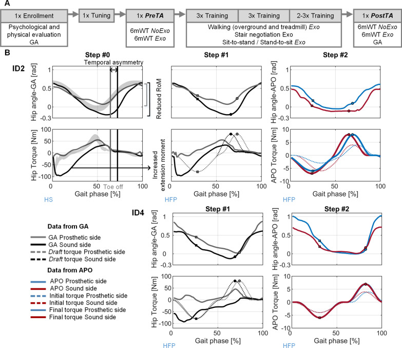 Methods: Seven participants (46-71 years old with different mobility levels) were included in the study and assigned to one of two groups (namely Symmetry and Speed groups) according to their prosthesis type, mobility level, and prior experience with the exoskeleton. Each participant engaged in a maximum of 12 sessions, divided into one Enrollment session, one Tuning session, two Assessment sessions (conducted before and after the training program), and eight Training sessions, each consisting of 20 minutes of robotically assisted overground walking combined with additional tasks. The two groups were assisted by different torque-phase profiles, aiming at improving symmetry for the Symmetry group and at maximizing the net power transferred by the APO for the Speed group. During the Assessment sessions, participants performed two 6-min walking tests (6mWTs), one with (Exo) and one without (NoExo) the exoskeleton, at either maximal (Symmetry group) or self-selected (Speed group) speed. Spatio-temporal gait parameters were recorded by commercial measurement equipment as well as by the APO sensors, and metabolic efficiency was estimated via the Cost of Transport (CoT). Additionally, kinetic and kinematic data were recorded before and after treatment in the NoExo condition.