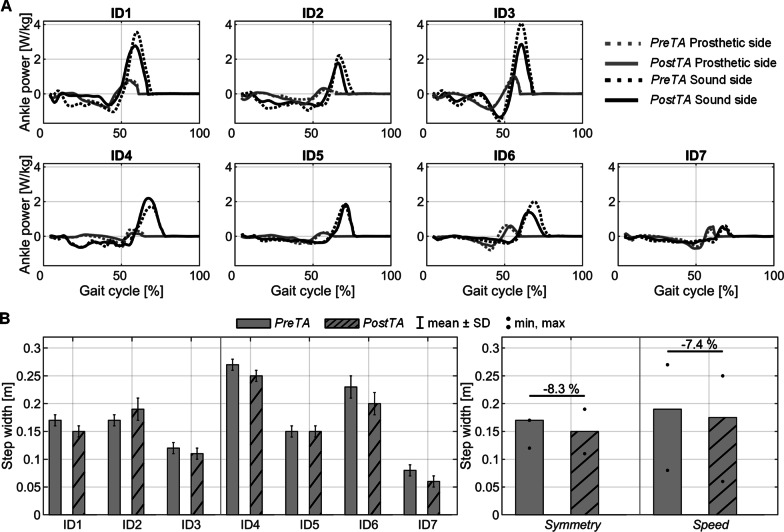Results: The one-month training protocol was found to be a feasible strategy to train TFAs, as all participants smoothly completed the clinical protocol with no relevant mechanical failures of the APO. The walking performance of participants improved after the training. During the 6mWT in NoExo, participants in the Symmetry and Speed groups respectively walked 17.4% and 11.7% farther and increased walking speed by 13.7% and 17.9%, with improved temporal and spatial symmetry for the former group and decreased energetic expenditure for the latter. Gait analysis showed that ankle power, step width, and hip kinematics were modified towards healthy reference levels in both groups. In the Exo condition metabolic efficiency was reduced by 3% for the Symmetry group and more than 20% for the Speed group.