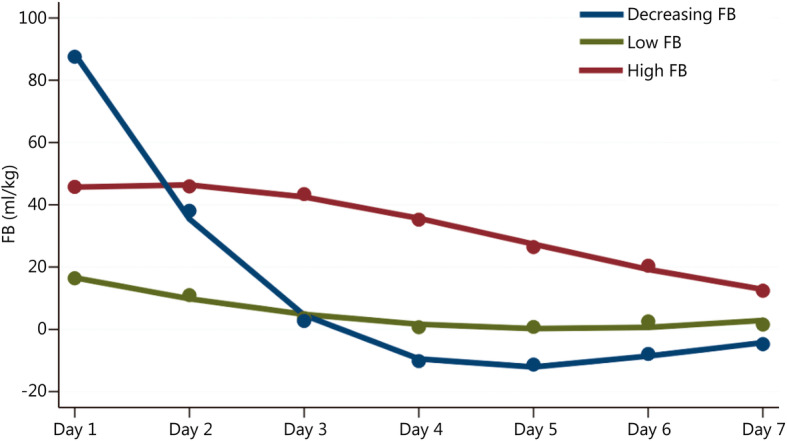 Methods: Patients were diagnosed with septic shock during the first 48 h, and sequential fluid data for the first 3 days of ICU admission were included. A group-based trajectory model (GBTM) which is designed to identify groups of individuals following similar developmental trajectories was used to identify latent subgroups of individuals following a similar progression of FB. The primary outcomes were hospital mortality, organ dysfunction, major adverse kidney events (MAKE) and severe respiratory adverse events (SRAE). We used multivariable Cox or logistic regression analysis to assess the association between FB trajectories and clinical outcomes.