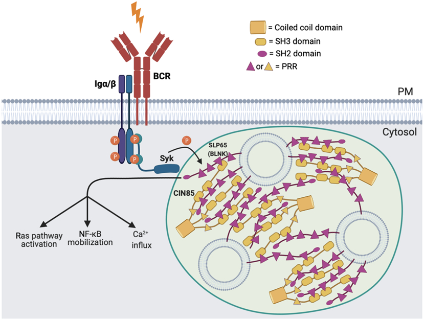 Immune signalling pathways convert pathogenic stimuli into cytosolic events that lead to the resolution of infection. Upon ligand engagement, immune receptors together with their downstream adaptors and effectors undergo substantial conformational changes and spatial reorganization. During this process, nanometre-to-micrometre-sized signalling clusters have been commonly observed that are believed to be hotspots for signal transduction. Because of their large size and heterogeneous composition, it remains a challenge to fully understand the mechanisms by which these signalling clusters form and their functional consequences. Recently, phase separation has emerged as a new biophysical principle for organizing biomolecules into large clusters with fluidic properties. Although the field is still in its infancy, studies of phase separation in immunology are expected to provide new perspectives for understanding immune responses. Here, we present an up-to-date view of how liquid-liquid phase separation drives the formation of signalling condensates and regulates immune signalling pathways, including those downstream of T cell receptor, B cell receptor and the innate immune receptors cyclic GMP-AMP synthase (cGAS)-stimulator of interferon genes (STING) and retinoic acid-inducible gene I protein (RIG-I). We conclude with a summary of the current challenges the field is facing and outstanding questions for future studies.