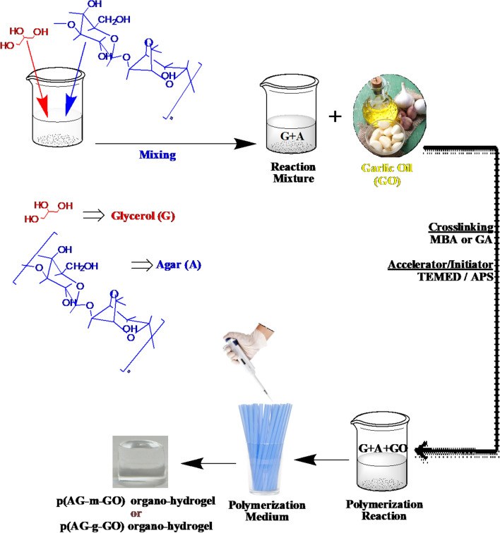 In this study, six different organo-hydrogels containing agar-glycerol (AG)-based garlic oil (GO) were synthesized using two different crosslinkers (N,N, methylenebisacrylamide (MBA), glutaraldehyde (GA)) to ensure the controlled release of ceftriaxone (Ce) and carboplatin (Cp). Synthesized organo-hydrogels were characterized by FT-IR. Afterward, swelling behaviors were investigated in DI, tap water, ethanol, acetone, ethanol/DI water (1:1), acetone/DI water (1:1) and gasoline environments and different pH. As a result of hemolysis, blood clotting and antioxidant analysis, organo-hydrogels have been shown to have blood compatibility and antioxidant properties. Ce and Cp release properties of the prepared organo-hydrogels were also determined. The highest Ce release rate was obtained to be 37.8% for p (AG-g-GO)3 at pH 8.0 after 7 days. However, the highest Cp release rate was found to be 95.4% for p (AG-g-GO)3 at pH 7.4 after 1 day.