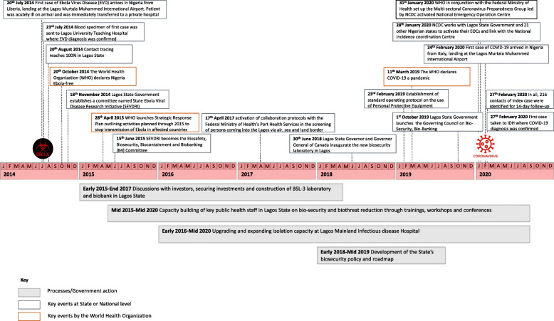 Discussion: Following the Ebola outbreak in 2014, the Lagos State government provided governance by developing a policy on emergency preparedness and biosecurity and provided oversight and coordination of emergency preparedness strategies. Capacities for emergency response were strengthened by training key staff, developing a robust surveillance system, and setting up a Biosafety Level 3 laboratory and biobank. Resource provision, in terms of finances and trained personnel for emergencies was prioritized by the government. With the onset of COVID-19, Lagos state was able to respond promptly to the outbreak using the centralized Incident Command Structure and the key activities of the Emergency Operations Centre. Contributory to effective response were partnerships with the private sectors, community engagement and political commitment.