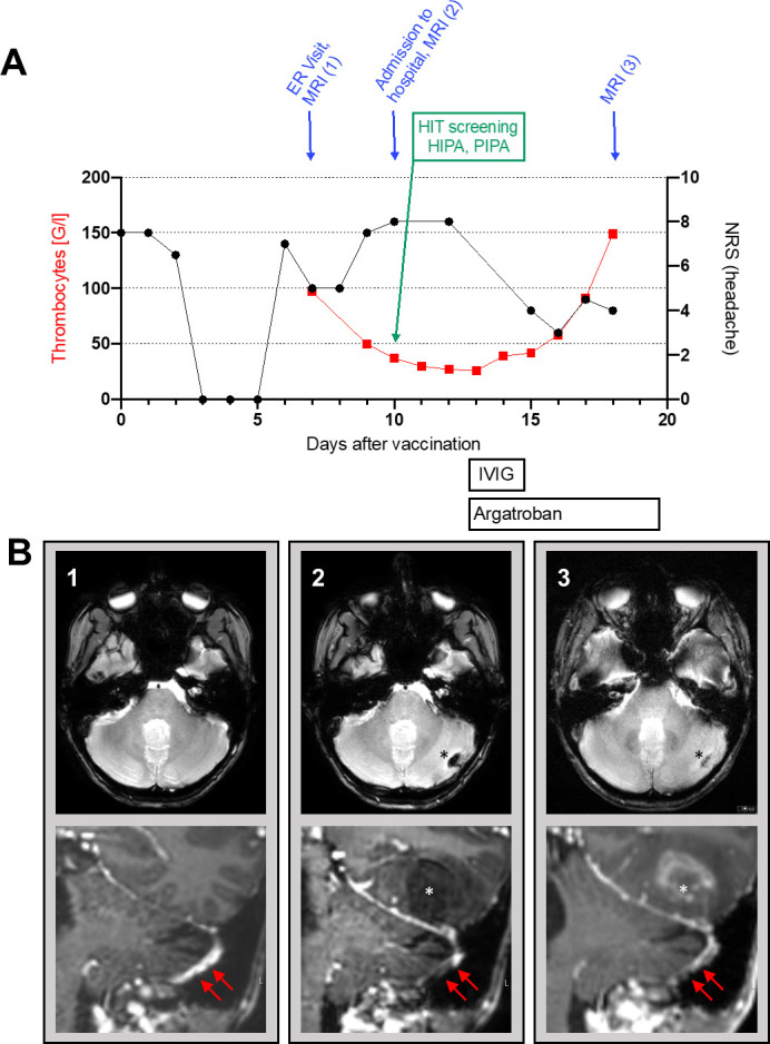 Vaccine-induced immune thrombotic thrombocytopenia (VITT) and cerebral venous sinus thrombosis (CVST) have been recently described as rare complications following vaccination against SARS-CoV-2 with vector vaccines. We report a case of a young woman who presented with VITT and cerebral CVST 7 days following vaccination with ChAdOx1 nCov-19 (AstraZeneca). While the initial MRI was considered void of pathological findings, MRI 3 days later revealed extensive CVST of the transversal and sigmoidal sinus with intracerebral haemorrhage. Diagnostic tests including a platelet-factor-4-induced platelet activation assay confirmed the diagnosis of VITT. Treatment with intravenous immunoglobulins and argatroban resulted in a normalisation of platelet counts and remission of CVST.