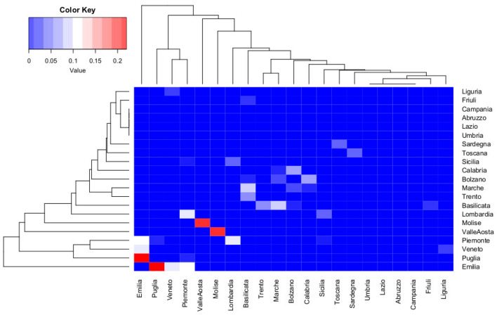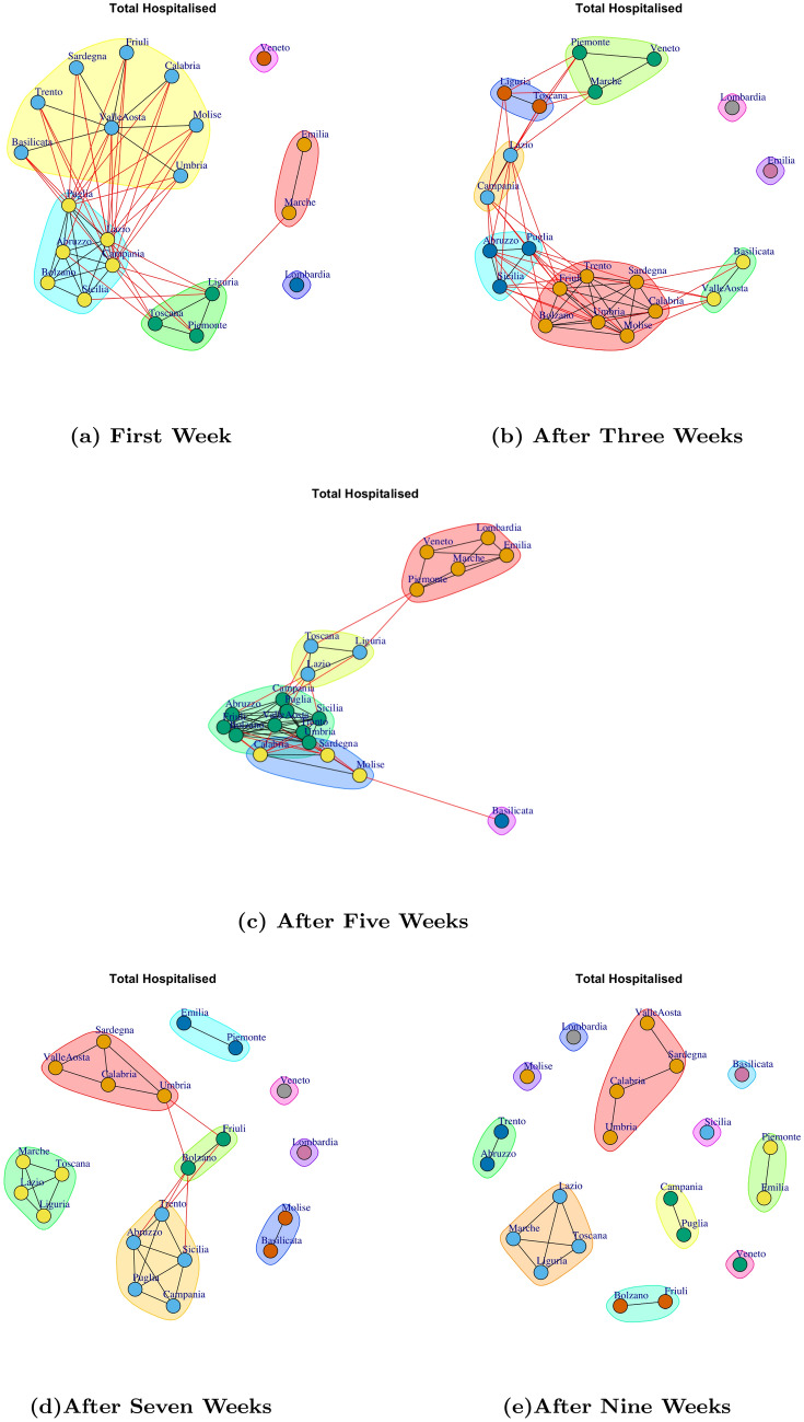 Understanding the evolution of the spread of the COVID-19 pandemic requires the analysis of several data at the spatial and temporal levels. Here, we present a new network-based methodology to analyze COVID-19 data measures containing spatial and temporal features and its application on a real dataset. The goal of the methodology is to analyze sets of homogeneous datasets (i.e. COVID-19 data taken in different periods and in several regions) using a statistical test to find similar/dissimilar datasets, mapping such similarity information on a graph and then using a community detection algorithm to visualize and analyze the spatio-temporal evolution of data. We evaluated diverse Italian COVID-19 data made publicly available by the Italian Protezione Civile Department at https://github.com/pcm-dpc/COVID-19/. Furthermore, we considered the climate data related to two periods and we integrated them with COVID-19 data measures to detect new communities related to climate changes. In conclusion, the application of the proposed methodology provides a network-based representation of the COVID-19 measures by highlighting the different behaviour of regions with respect to pandemics data released by Protezione Civile and climate data. The methodology and its implementation as R function are publicly available at https://github.com/mmilano87/analyzeC19D.