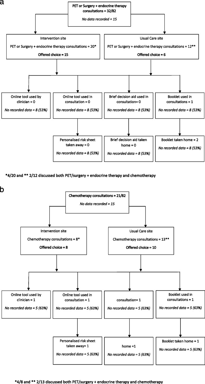 Results: Eighty-two patients, mean age 75.5 (range 70-93), provided data for the process evaluation. Seventy-three interviews were completed with patients. Ten clinicians from six intervention sites took part in telephone interviews. Dose: Ninety-one members of staff in the intervention arm received intervention training. Reach: The online tool was accessed on 324 occasions by 27 clinicians. Reasons for non-use of the online tool were commonly that the patient had already made a decision or that there was no online access in the clinic. Of the 32 women for whom there were data available, fifteen from the intervention arm and six from the usual care arm were offered a choice of treatment. Fidelity: Clinicians used the online tool in different ways, with some using it during the consultation and others checking the online survival estimates before the consultation. Adaptation: There was evidence of adaptation when using the DESIs. A lack of infrastructure, e.g. internet access, was a barrier to the use of the online tool. The brief decision aid was rarely used. Mediators: Shared decision-making: Most patients felt able to contribute to decision-making and expressed high levels of satisfaction with the process. Participants' responses to intervention: Six patients reported the DESIs to be very useful, one somewhat useful and two moderately useful.