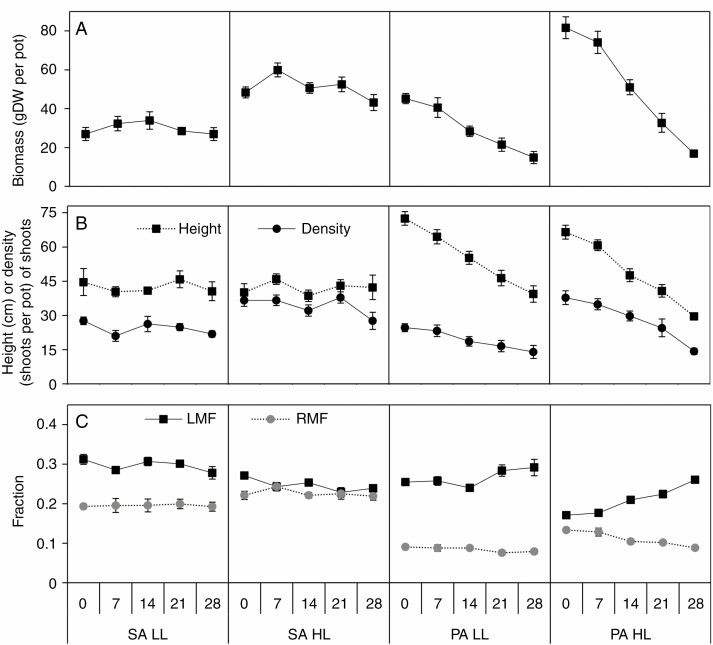 Key results: Salinity reduced the biomass, height and shoot density of P. australis from 81.7 g dry weight (DW), 0.73 m and 37 shoots per pot at a salinity of 0 ppt to 16.8 gDW, 0.3 m and 14 shoots per pot at a salinity of 28 ppt. Biomass, height and shoot density of S. anglica did not respond or were only slightly reduced at the highest salinity of 28 ppt. High salinity also resulted in a higher tissue concentration of N and P in P. australis. Both species had low ability to acclimate to the lower light flux. Shade acclimation in S. anglica occurred via modest changes in specific leaf area, pigment content and biomass allocation.