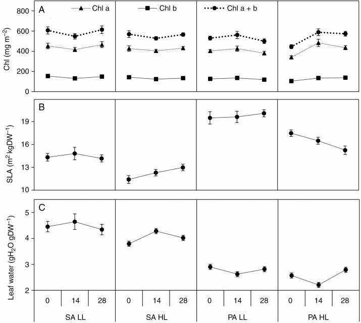 Methods: The C4 species Spartina anglica and the C3 species Phragmites australis were grown at five salinity levels (0, 7, 14, 21 and 28 ppt) and two light fluxes (100 % and 50 % of natural daylight) in an outdoor experimental setup for 102 d with full access to nutrients.