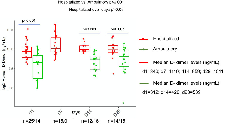 Early detection of severe forms of COVID-19 is absolutely essential for timely triage of patients. We longitudinally followed-up two well-characterized patient groups, hospitalized moderate to severe (n = 26), and ambulatory mild COVID-19 patients (n = 16) at home quarantine. Human D-dimer, C-reactive protein (CRP), ferritin, cardiac troponin I, interleukin-6 (IL-6) levels were measured on day 1, day 7, day 14 and day 28. All hospitalized patients were SARS-CoV-2 positive on admission, while all ambulatory patients were SARS-CoV-2 positive at recruitment. Hospitalized patients had higher D-dimer, CRP and ferritin, cardiac troponin I and IL-6 levels than ambulatory patients (p < 0.001, p < 0.001, p = 0.016, p = 0.035, p = 0.002 respectively). Hospitalized patients experienced significant decreases in CRP, ferritin and IL-6 levels from admission to recovery (p < 0.001, p = 0.025, and p = 0.001 respectively). Cardiac troponin I levels were high during the acute phase in both hospitalized and ambulatory patients, indicating a potential myocardial injury. In summary, D-dimer, CRP, ferritin, cardiac troponin I, IL-6 are predictive laboratory markers and can largely determine the clinical course of COVID-19, in particular the prognosis of critically ill COVID-19 patients.