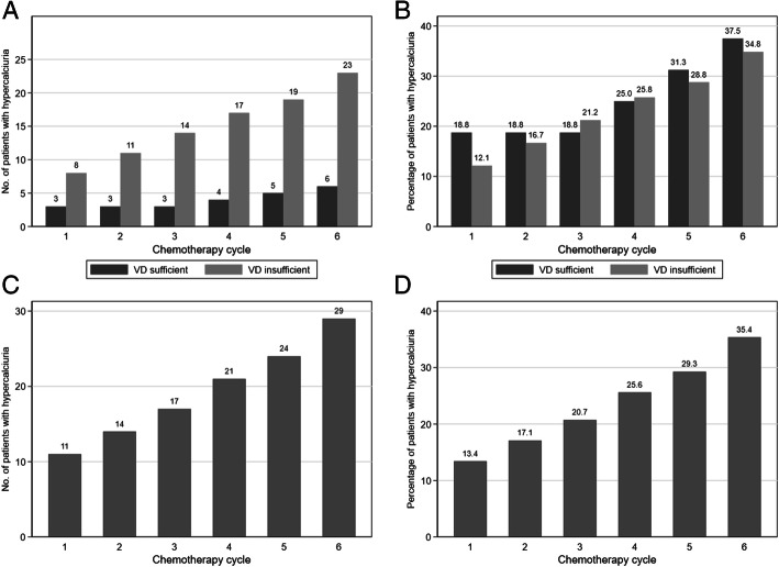 Results: The primary endpoint could be evaluated in 82 patients. Most patients (n = 66, 80.5%) had VD insufficiency (< 30 ng/mL) at baseline. Hypercalciuria was detected in 29 patients (35.4%; 95% CI: 25.6-46.5) between D1C1 and D1C6, but was not clinically significant in any of the affected patients. The percentage of hypercalciuria events was not different between patients with sufficient and insufficient baseline VD levels (34.8% vs. 37.5%), and between patients who received or not VD supplementation (37.5% vs. 34.5%,).