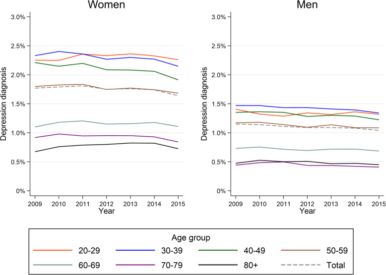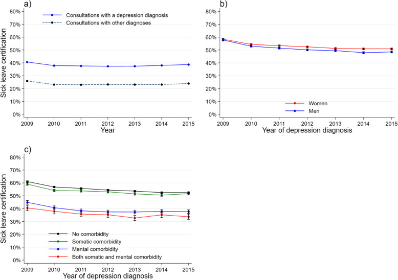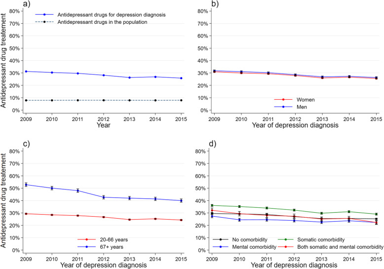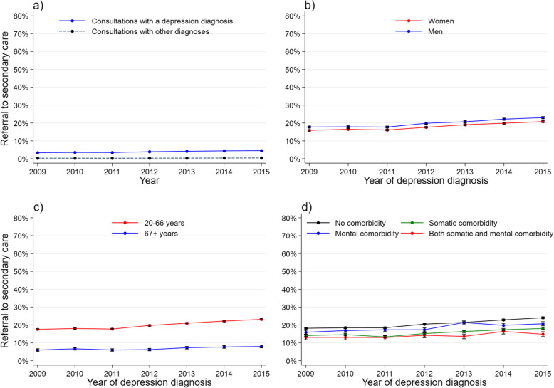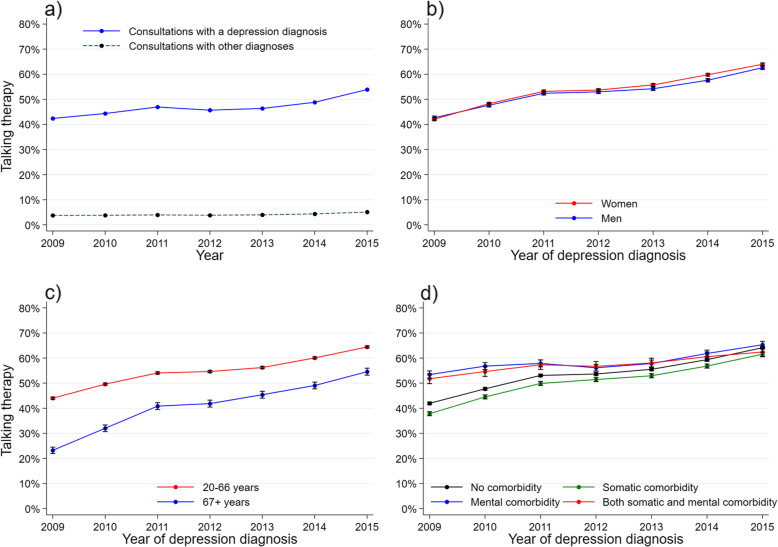 Results: We included 365,947 new depression diagnoses. Mean patient age was 44 years (SD = 16), 61.9 % were women, 41.2 % had comorbidity. From 2009 to 2015, proportions of patients receiving talking therapy (42.3-63.4 %), long consultations (56.4-71.8 %), and referral to secondary care (16.6-21.6 %) increased, while those receiving drug treatment (31.3-25.9 %) and sick-listing (58.1-50 %) decreased. The trends were different for gender (women had a greater increase in talking therapy and a smaller decrease in sick-listing, compared to men), age (working-aged patients had a smaller increase in talking therapy, a greater increase in long consultations, and a smaller decrease in antidepressant drug use, compared to older patients) and comorbidity (patients with mental comorbidity had a smaller increase in talking therapy and a greater increase in long consultations, compared to those with no comorbidity and somatic comorbidity).