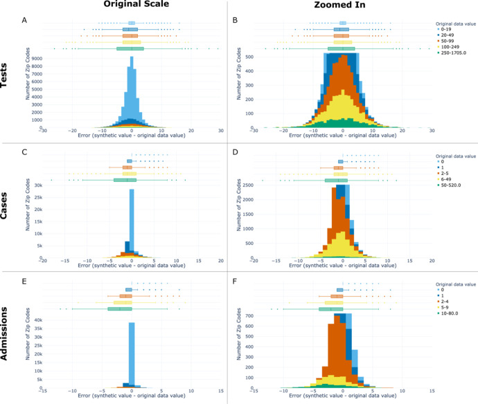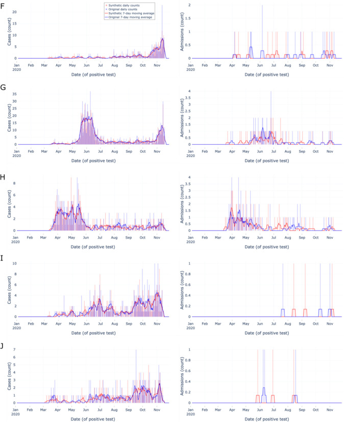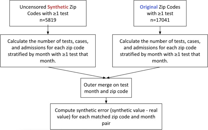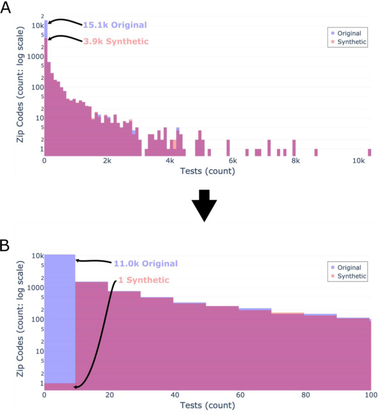 Results: In general, synthetic data closely matched original data for epidemic curves, patient characteristics, and outcomes. Synthetic data suppressed labels of zip codes with few total tests (mean=2.9±2.4; max=16 tests; 66% reduction of unique zip codes). Epidemic curves and monthly indicator counts were similar between synthetic and original data in a random sample of the most tested (top 1%; n=171) and for all unsuppressed zip codes (n=5,819), respectively. In small sample sizes, synthetic data utility was notably decreased.