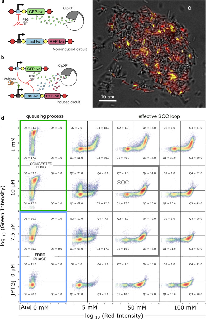 Complex dynamical fluctuations, from intracellular noise, brain dynamics or computer traffic display bursting dynamics consistent with a critical state between order and disorder. Living close to the critical point has adaptive advantages and it has been conjectured that evolution could select these critical states. Is this the case of living cells? A system can poise itself close to the critical point by means of the so-called self-organized criticality (SOC). In this paper we present an engineered gene network displaying SOC behaviour. This is achieved by exploiting the saturation of the proteolytic degradation machinery in E. coli cells by means of a negative feedback loop that reduces congestion. Our critical motif is built from a two-gene circuit, where SOC can be successfully implemented. The potential implications for both cellular dynamics and behaviour are discussed.