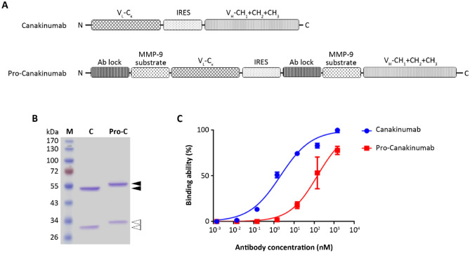 Canakinumab is a fully human monoclonal antibody that specifically neutralizes human interleukin (IL)-1β and has been approved by the US Food and Drug Administration for treating different types of autoinflammatory disorders such as cryopyrin-associated periodic syndrome, tumor necrosis factor receptor-associated periodic syndrome and systemic juvenile idiopathic arthritis. However, long-term systemic neutralization of IL-1β by Canakinumab may cause severe adverse events such as serious upper respiratory tract infections and inflammation, thereby decreasing the quality of life of patients. Here, we used an IgG1 hinge as an Ab lock to cover the IL-1β-binding site of Canakinumab by linking with matrix metalloprotease 9 (MMP-9) substrate to generate pro-Canakinumab that can be specifically activated in the inflamed regions in autoinflammatory diseases to enhance the selectivity and safety of treatment. The Ab lock significantly inhibited the IL-1β-binding by 68-fold compared with Canakinumab, and MMP-9 completely restored the IL-1β neutralizing ability of pro-Canakinumab within 60 min and blocked IL-1β-downstream signaling and IL-1β-regulated genes (i.e., IL-6). It is expected that MMP-9 cleavable and efficient Ab lock will be able to significantly enhance the selective reaction of Canakinumab at the disease site and reduce the on-target toxicities of Canakinumab during systemic circulation, thereby showing potential for development to improve the safety and quality of life of patients with autoinflammatory disorders in the future.