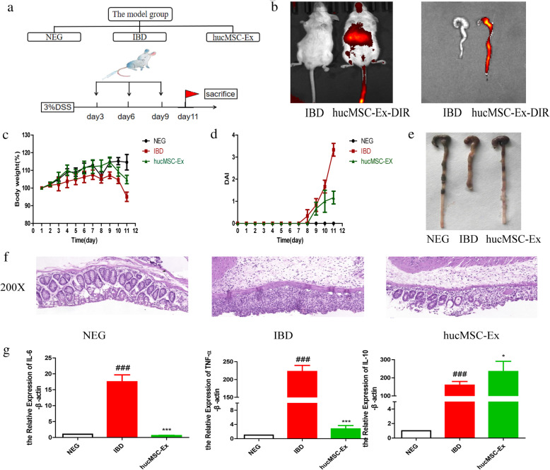Methods: In vivo, we used BALB/c mice to establish a dextran sulfate sodium (DSS)-induced colitis model and administrated hucMSC-derived exosomes intravenously to estimate its curative effect. Human myeloid leukemia mononuclear (THP-1) cells and mouse peritoneal macrophages (MPMs) were stimulated with lipopolysaccharides (LPS) and Nigericin to activate NLRP3 inflammasomes, which simulated an inflammation environment in vitro. A microRNA mimic was used to verify the role of miR-378a-5p/NLRP3 axis in the colitis repair.
