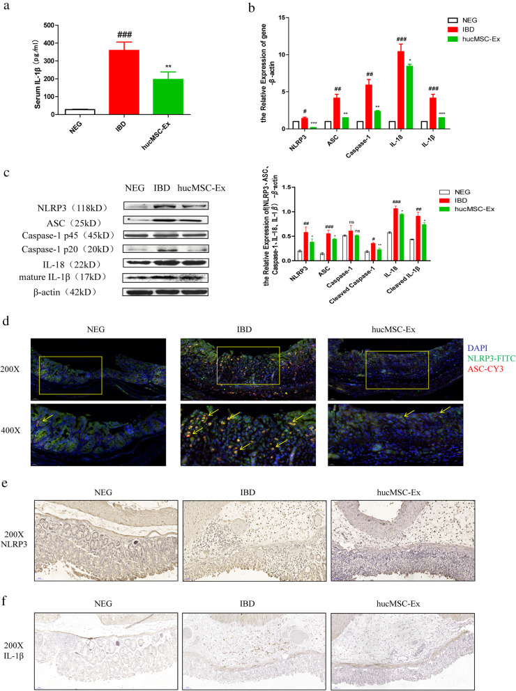 Results: hucMSC-derived exosomes inhibited the activation of NLRP3 inflammasomes in the mouse colon. The secretion of interleukin (IL)-18, IL-1β, and Caspase-1 cleavage was suppressed, resulting in reduced cell pyroptosis. The same outcome was observed in the in vitro cell experiments, where the co-culture of THP-1 cells and MPMs with hucMSC-derived exosomes caused decreased expression of NLRP3 inflammasomes and increased cell survival. Furthermore, miR-378a-5p was highly expressed in hucMSC-derived exosomes and played a vital function in colitis repair.