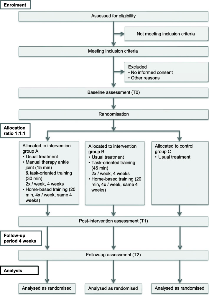 Methods: This is a protocol of a 4-week prospective randomised controlled parallel pilot trial in people post stroke at the chronic stage with limited upper ankle joint mobility and an impairment in balance and mobility. At a German outpatient therapy centre using 1:1:1 allocation, 36 patients will be randomised into one of three groups: 15-min talocrural joint MT plus 30-min specific TOT (group A), 45-min specific TOT (group B), and controls (group C). Training will be goal-oriented including tasks that are based on daily activities and increased in difficulty utilising predefined progression criteria based on patients' skill levels. Interventions will be provided face-to-face 2 times per week, for 4 weeks, in addition to 20-min concurrent x4 weekly home-based training sessions. Data will be collected by blinded assessors at baseline, post-intervention and 4-week follow-up. The primary outcome will be feasibility assessed by recruitment, retention and adherence rates, compliance, adverse events, falls and the acceptability of the intervention. Secondary outcomes will be walking speed, single and dual tasking functional mobility, ankle range of motion, disability and health-related quality of life.