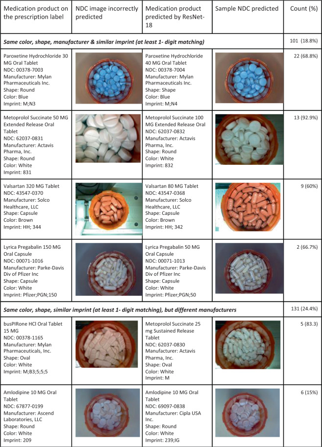 Technology assistance of pharmacist verification tasks through the use of machine intelligence has the potential to detect dangerous and costly pharmacy dispensing errors. National Drug Codes (NDC) are unique numeric identifiers of prescription drug products for the United States Food and Drug Administration. The physical form of the medication, often tablets and capsules, captures the unique features of the NDC product to help ensure patients receive the same medication product inside their prescription bottle as is found on the label from a pharmacy. We report and evaluate using an automated check to predict the shape, color, and NDC for images showing a pile of pills inside a prescription bottle. In a test set containing 65,274 images of 345 NDC classes, overall macro-average precision was 98.5%. Patterns of incorrect NDC predictions based on similar colors, shapes, and imprints of pills were identified and recommendations to improve the model are provided.