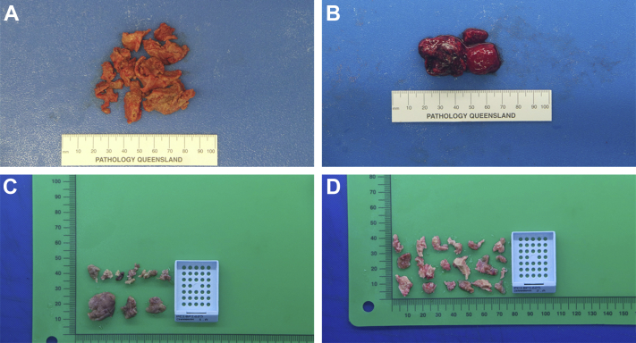 Endocardial Decortication (A, C, D) The right ventricle was infiltrated with chronic, organized, and fibrin-rich thrombus. (B) The right atrium had evidence of fresh, red thrombus secondary to stasis.