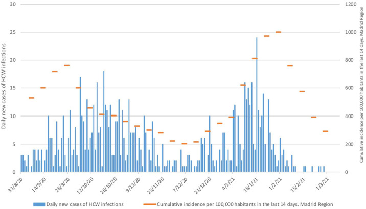 Results: Two weeks after finishing the first round of vaccinations daily new cases of HCW infections (symptomatic and asymptomatic) decreased substantially and cumulative cases of infected HCW and hospitalized COVID-19 patients started to diverge. No new positive cases of HCW infection were registered seven days after the second dose of BNT162b2 mRNA COVID-19 vaccine.