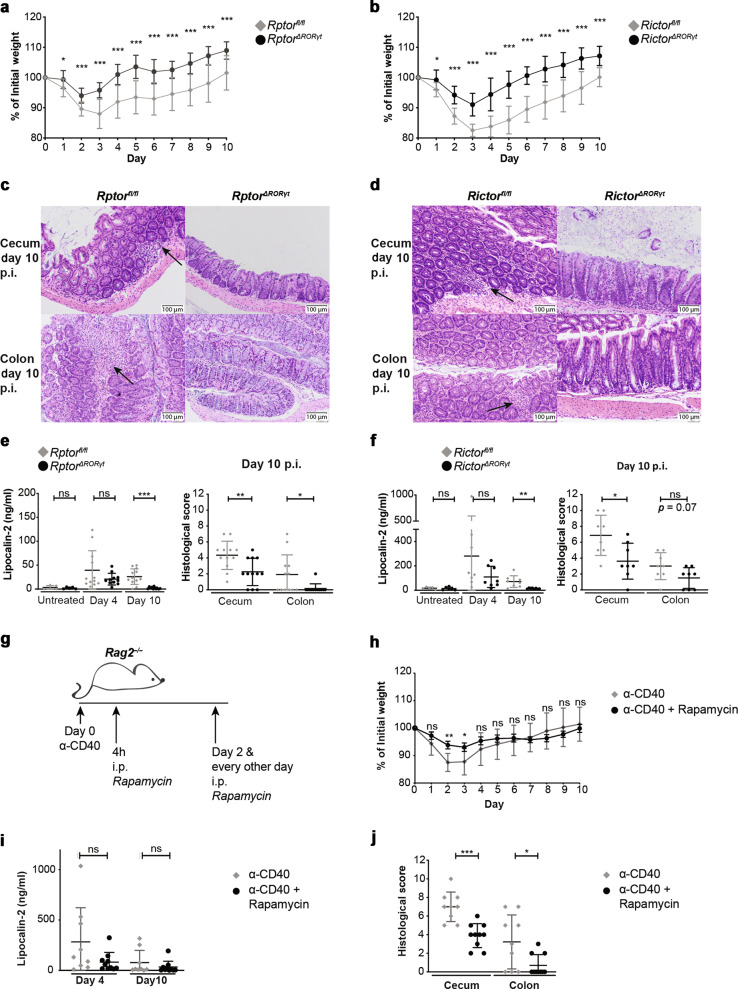 Innate lymphoid cells (ILCs) have a protective immune function at mucosal tissues but can also contribute to immunopathology. Previous work has shown that the serine/threonine kinase mammalian target of rapamycin complex 1 (mTORC1) is involved in generating protective ILC3 cytokine responses during bacterial infection. However, whether mTORC1 also regulates IFN-γ-mediated immunopathology has not been investigated. In addition, the role of mTORC2 in ILC3s is unknown. Using mice specifically defective for either mTORC1 or mTORC2 in ILC3s, we show that both mTOR complexes regulate the maintenance of ILC3s at steady state and pathological immune response during colitis. mTORC1 and to a lesser extend mTORC2 promote the proliferation of ILC3s in the small intestine. Upon activation, intestinal ILC3s produce less IFN-γ in the absence of mTOR signaling. During colitis, loss of both mTOR complexes in colonic ILC3s results in the reduced production of inflammatory mediators, recruitment of neutrophils and immunopathology. Similarly, treatment with rapamycin after colitis induction ameliorates the disease. Collectively, our data show a critical role for both mTOR complexes in controlling ILC3 cell numbers and ILC3-driven inflammation in the intestine.