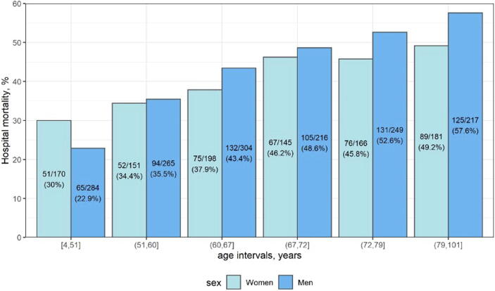 Results: A total of 2546 participants were included (mean age 65 years; 60.3% male). Overall, 70.8% were admitted to intensive care units and 54.2% had elevated troponin levels. In-hospital mortality was 41.7%. An interaction among sex, age and mortality was found (p = 0.007). Younger women presented higher rates of death than men (30.0% vs 22.9%), while older men presented higher rates of death than women (57.6% vs 49.2%). The strongest factors associated with in-hospital mortality were need for mechanical ventilation (odds ratio [OR] 8.2, 95% confidence interval [CI] 5.4-12.7), elevated C-reactive protein (OR 2.3, 95% CI 1.7-2.9), cancer (OR 1.8, 95 %CI 1.2-2.9), and elevated troponin levels (OR 1.8, 95% CI 1.4-2.3). A risk score was developed for risk assessment of in-hospital mortality.