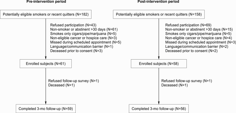 Few patients with cancer receive help in quitting smoking. We conducted a pilot before-after trial to determine the effectiveness of an evidence-based practice intervention, including brief cessation counseling during the clinic visit and referral to an onsite tobacco treatment specialist, on the delivery of stop smoking services and cessation outcomes at a NCI-designated Comprehensive Cancer Center. During the post-implementation period, cancer patients who smoke were more likely to have received assistance in quitting in clinic and during 3-month follow-up. This change in process of care did not translate into improved short-term abstinence from tobacco, however. Greater and more sustained participation in tobacco treatment will be needed to improve cessation outcomes in this population.