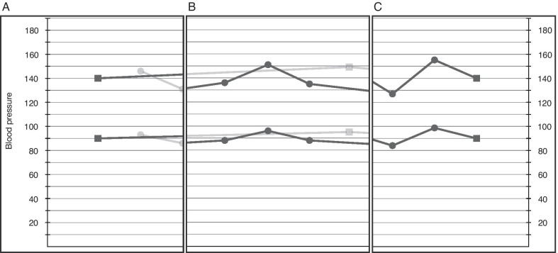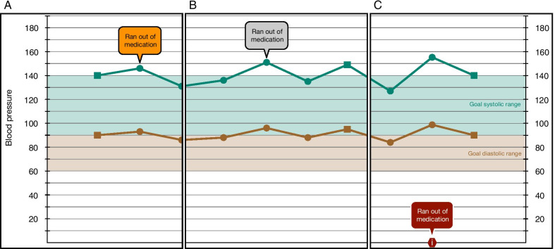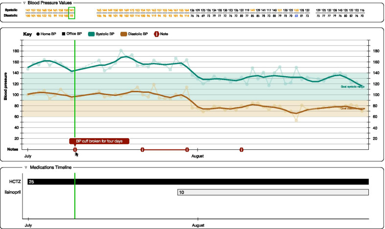 Conclusions: We developed a data display for substantial amounts of blood pressure measurements that is both simple to understand for patients, but powerful enough to inform clinical decision making. The display used a line graph format for ease of understanding, a LOWESS function for smoothing data to reduce the weight users placed on outlier measurements, colored goal range bands to allow users to quickly determine if measurements were in range, a medication timeline to help link recorded blood pressure measurements with the medications a patient was taking. A data display such as this, specifically designed to encourage shared decision making between hypertensive patients and their healthcare providers, could help us overcome the clinical inertia that often results in a lack of treatment intensification, leading to better care for the 35 million Americans with uncontrolled hypertension.
