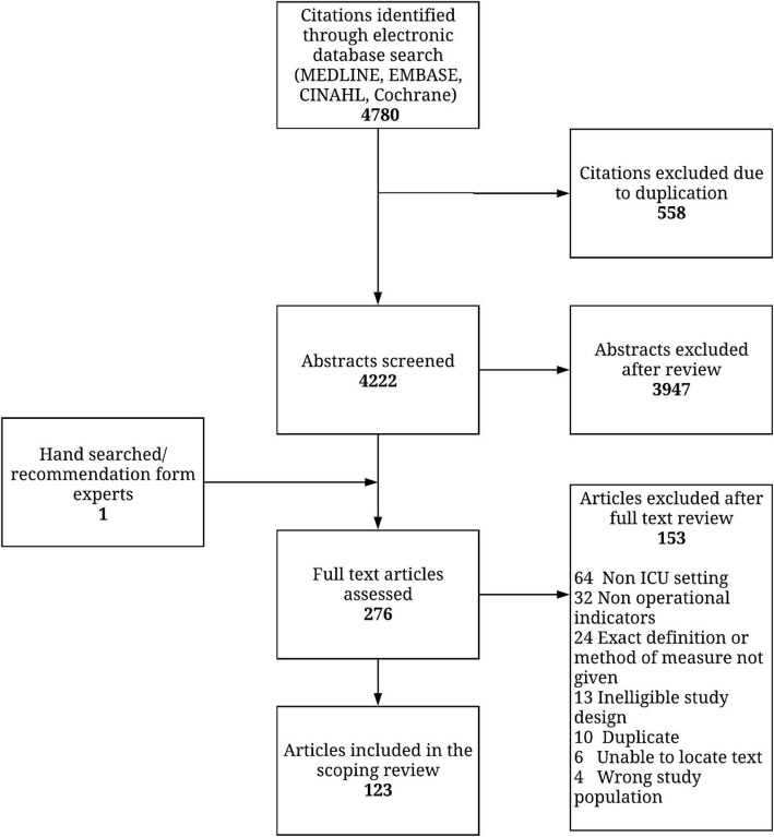 Results: The search identified 4780 citations. Review of abstracts led to retrieval of 276 full-text articles, of which 123 articles were accepted. Fifty-one unique QIs in ICU were classified using the three components of health care quality proposed by the High Quality Health Systems (HQSS) framework. Adverse events including hospital acquired infections (13.7%), hospital processes (54.9%), and outcomes (31.4%) were the most common QIs identified. Patient reported outcome QIs accounted for less than 6%. Barriers to the implementation of QIs were described in 35.7% of articles and divided into operational barriers (51%) and acceptability barriers (49%).