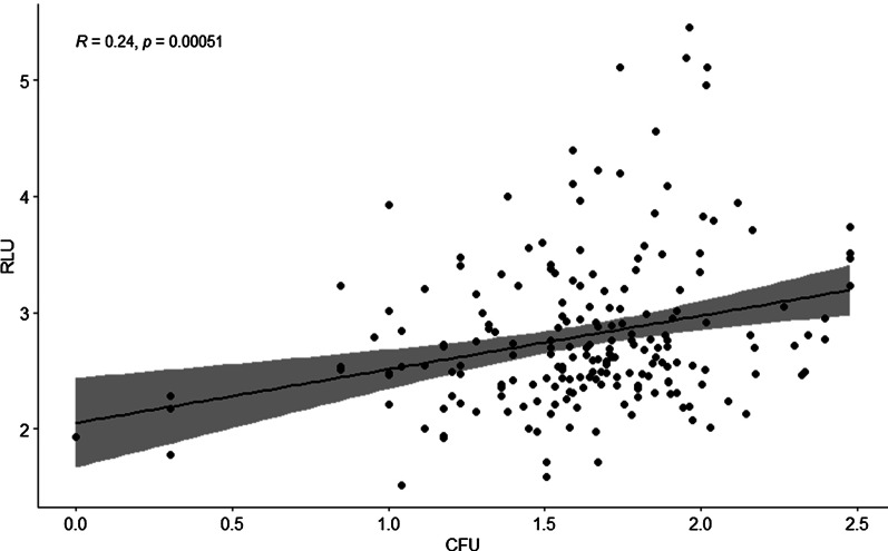 Results: In total 200 paired measurements were conducted, 200 ATP measurements and 200 ACC's. The mean of all ATP measurements tested on the same surface was calculated, as was for all 200 ACC's. There was a strong correlation between the mean of two ATP measurements on two different sites on the same fomite (R = 0.800, p < 0.001) as well as between two ACC measurements on the same fomite (R = 0.667, p < 0.001). A much weaker correlation was found between RLU values and ACC's (R = 0.244, p < 0.001).