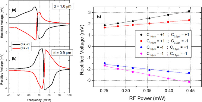 In this work, a new mechanism to combine a non-volatile behaviour with the spin diode detection of a vortex-based spin torque nano-oscillator (STVO) is presented. Experimentally, it is observed that the spin diode response of the oscillator depends on the vortex chirality. Consequently, fixing the frequency of the incoming signal and switching the vortex chirality results in a different rectified voltage. In this way, the chirality can be deterministically controlled via the application of electrical signals injected locally in the device, resulting in a non-volatile control of the output voltage for a given input frequency. Micromagnetic simulations corroborate the experimental results and show the main contribution of the Oersted field created by the input RF current density in defining two distinct spin diode detections for different chiralities. By using two non-identical STVOs, we show how these devices can be used as programmable non-volatile synapses in artificial neural networks.