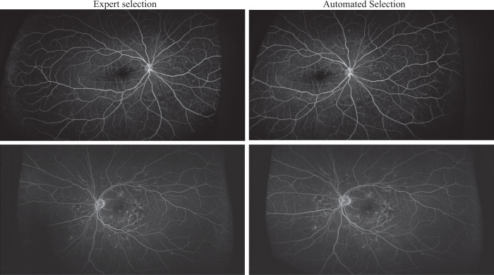 Methods: Cumulative retinal vessel areas (RVA) were extracted from all available UWFA frames. Cubic splines were fitted for serial vascular assessment throughout the angiographic phases of eyes with diabetic retinopathy (DR), sickle cell retinopathy (SCR), or normal retinal vasculature. The image with maximum RVA was selected as the optimum early phase. A late phase frame was selected at a minimum of 4 min that most closely mirrored the RVA from the selected early image. Trained image analysts evaluated the selected pairs.