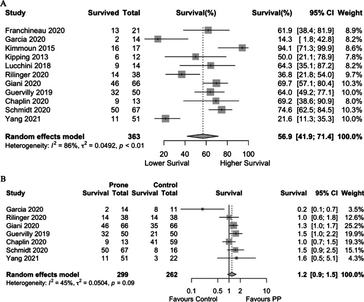 Results: Of 812 potentially relevant publications, 12 studies (640 patients) met our inclusion criteria. Due to overlapping study populations, 11 studies were included in the final meta-analysis. Cumulative survival in patients that underwent PP was 57% (95% CI 41.9-71.4, high certainty). Patients that underwent PP had longer ICU LOS (+ 14.5 days, 95% CI 3.4-25.7, p = 0.01) and ECMO duration (+ 9.6 days, 95% CI 5.5-13.7, p < 0.0001). After PP, patients had significantly higher PaO2/FiO2 ratio, lower PaCO2 and reduced ventilator driving pressure, and no major complications were reported.