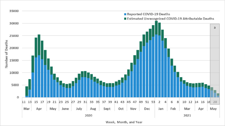 Findings: We estimated that 766,611 deaths attributable to COVID-19 occurred in the United States from March 8, 2020-May 29, 2021. Of these, 184,477 (24%) deaths were not documented on death certificates. Eighty-two percent of unrecognized deaths were among persons aged ≥65 years; the proportion of unrecognized deaths were 0•24-0•31 times lower among those 0-17 years relative to all other age groups. More COVID-19-attributable deaths were not captured during the early months of the pandemic (March-May 2020) and during increases in SARS-CoV-2 activity (July 2020, November 2020-February 2021).
