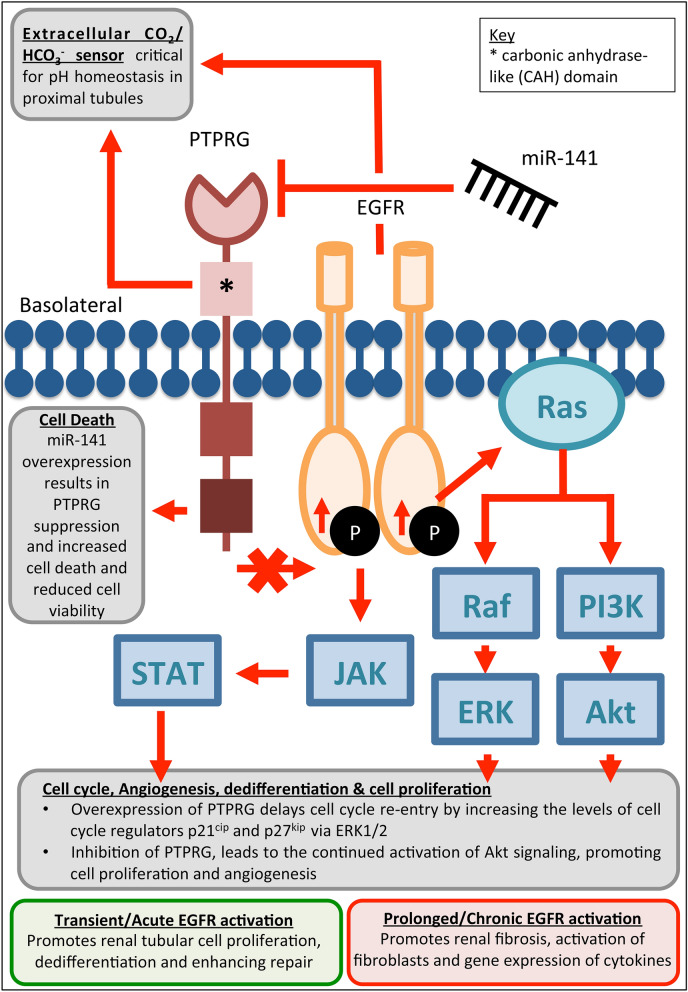 Acute kidney injury (AKI) is a global clinical problem characterised by a sudden decline in renal function and mortality as high as 60%. Current AKI biomarkers have limited ability to classify disease progression and identify underlying pathological mechanisms. Here we hypothesised that alterations in urinary microRNA profiles could predict AKI recovery/nonrecovery after 90 days, and that injury-specific changes would signify microRNA mediators of AKI pathology. Comparison of urinary microRNA profiles from AKI patients with controls detected significant injury-specific increases in miR-21, miR-126 and miR-141 (p < 0.05) and decreases in miR-192 (p < 0.001) and miR-204 (p < 0.05). Expression of miR-141 increased in renal proximal tubular epithelial cells (PTECs) under oxidative stress in vitro and unilateral ischaemic reperfusion injury in vivo. Forced miR-141 expression in the presence of H2O2 increased PTEC death and decreased cell viability. Of nine messenger RNA targets with two or more miR-141 3'-untranslated region binding sites, we confirmed protein tyrosine phosphatase receptor type G (PTPRG) as a direct miR-141 target in PTECs. PTPRG-specific siRNA knockdown under oxidative stress increased PTEC death and decreased cell viability. In conclusion, we detected significant alterations in five urinary microRNAs following AKI, and identified proximal tubular cell PTPRG as a putative novel therapeutic target.