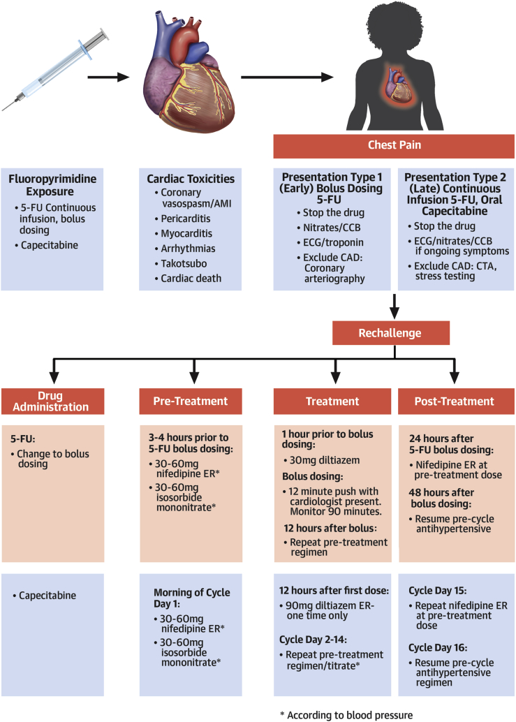 Keywords: 5-FU, 5-fluorouracil; CAD, coronary artery disease; CTA, computed tomography angiogram; CV, cardiovascular; FLOX, bolus dosing 5 fluorouracil, leucovirin, oxaliplatin; FOLFOX, continuous infusion 5 fluorouracil, leucovorin, oxaliplatin; cardiotoxicity; coronary vasospasm; fluoropyrimidine.
