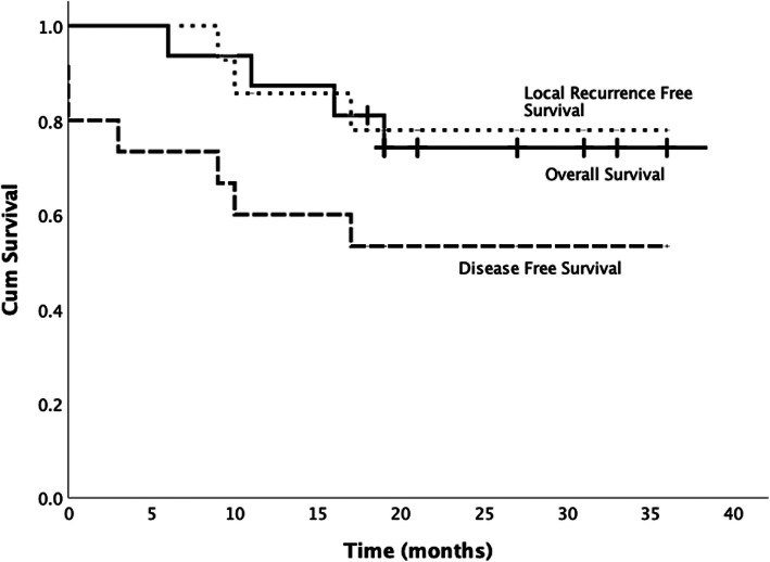 Results: Surgical margins were wide in 12 patients (80%), wide-contaminated in 1 patient (6.7%), and marginal in 2 patients (13.3%). R0 resection was achieved in 12 (80%) patients and R1 resection in 3 patients. There were three local recurrences (20%) occurred at a mean time of 11 months postoperatively. No local recurrence was observed at sacral osteotomy. The overall one-year and three-year survival rate was 86.7% and 72.7% respectively.Complications occurred in three patients.